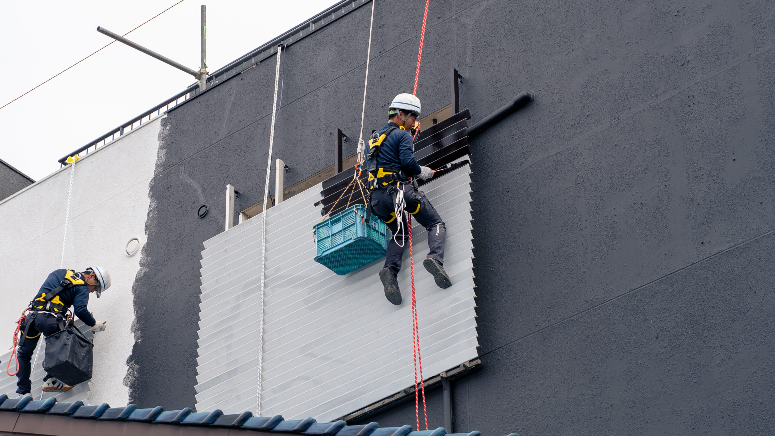 隣家との距離が近く、足場を設置できない面にはロープアクセス工法を活用、その他3面には足場を設置して施工。工期・費用を削減したうえで、安全かつ問題なく施工を完了することができました。